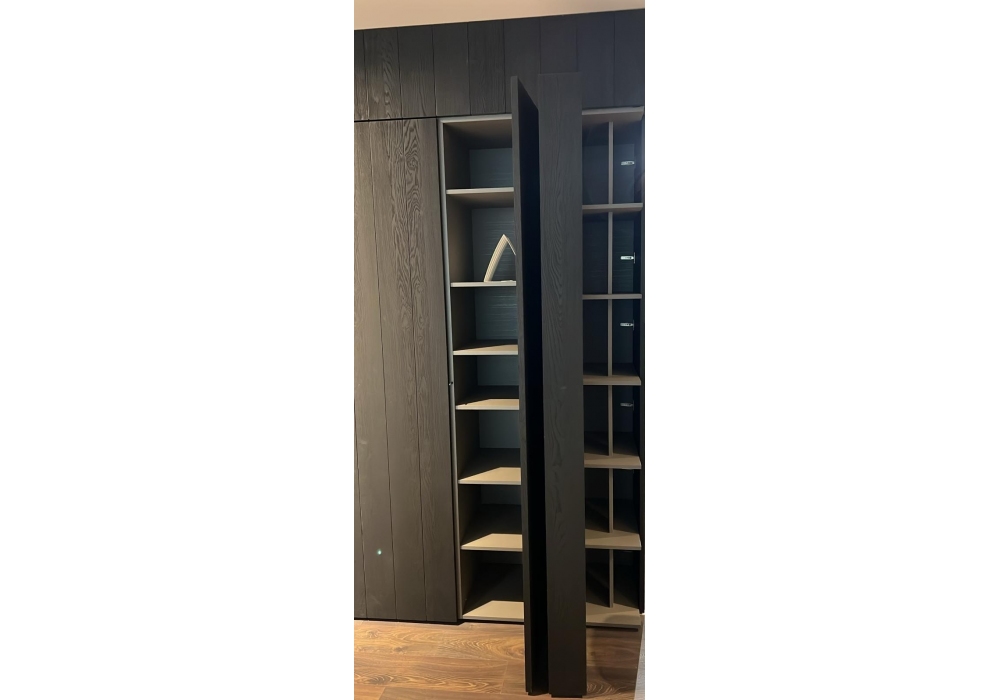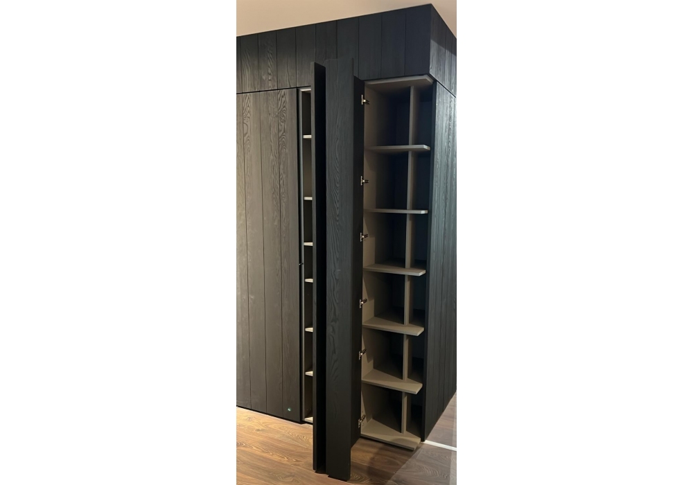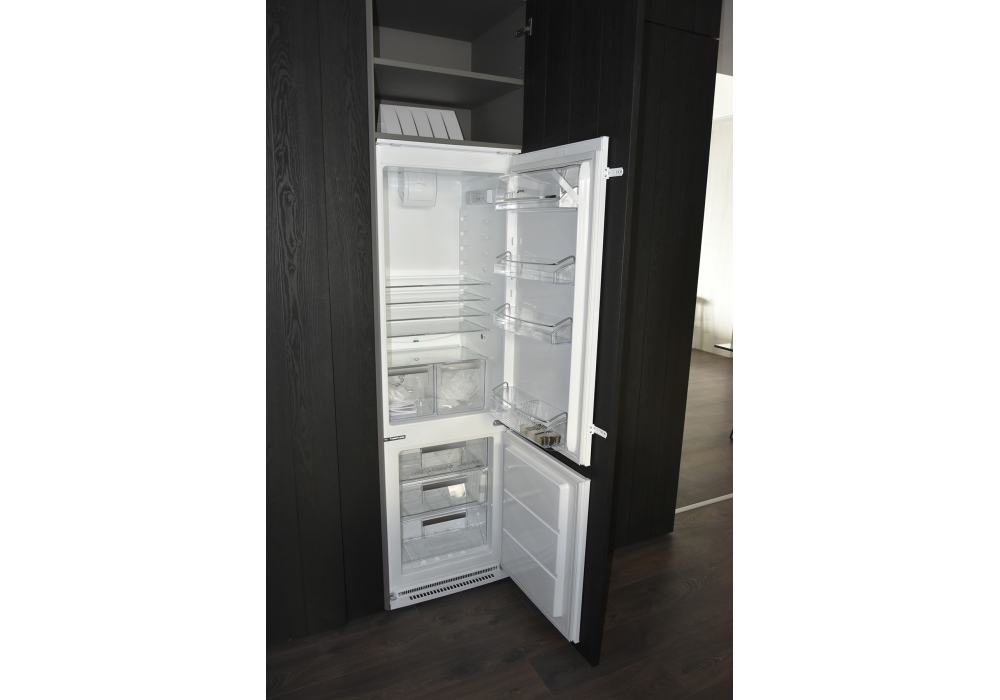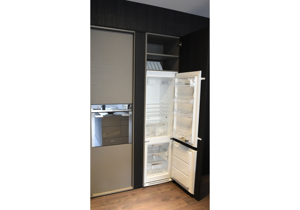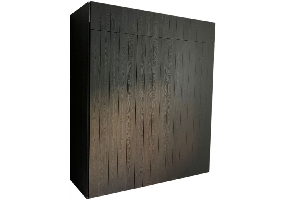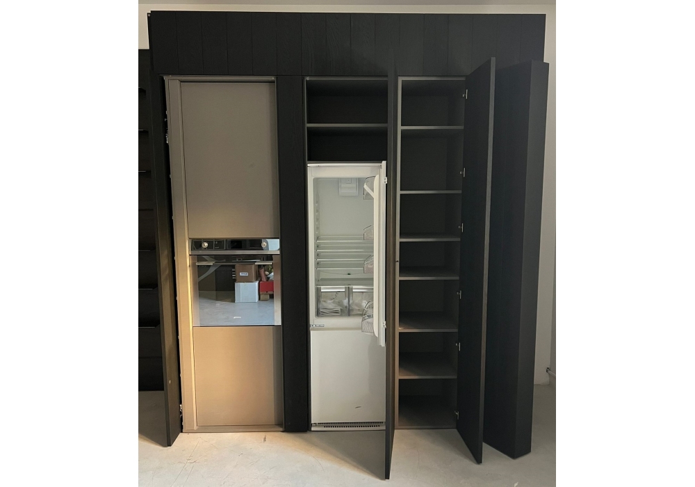 Blade von Modulnova entworfen, ist eine Lebensmittelaufbewahrung mit internen Regalen und Geräten (Backofen, Kühlschrank und Gefrierschrank). Schränke aus schwarzer Eichenholz.