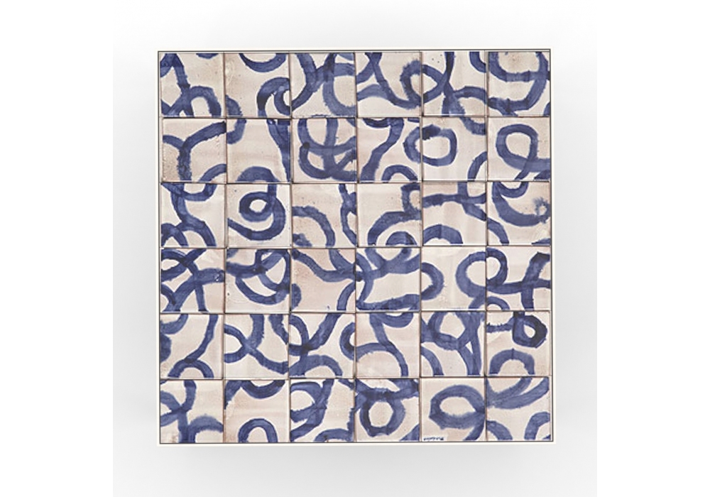 Cocci von Marella Ferrera für Paola Lenti ist ein Beistelltisch mit einer Platte aus Aquarell-Fayence-Elementen und einer Gestell aus pulverlackiertem Edelstahl in dunkelgrauer Farbe.