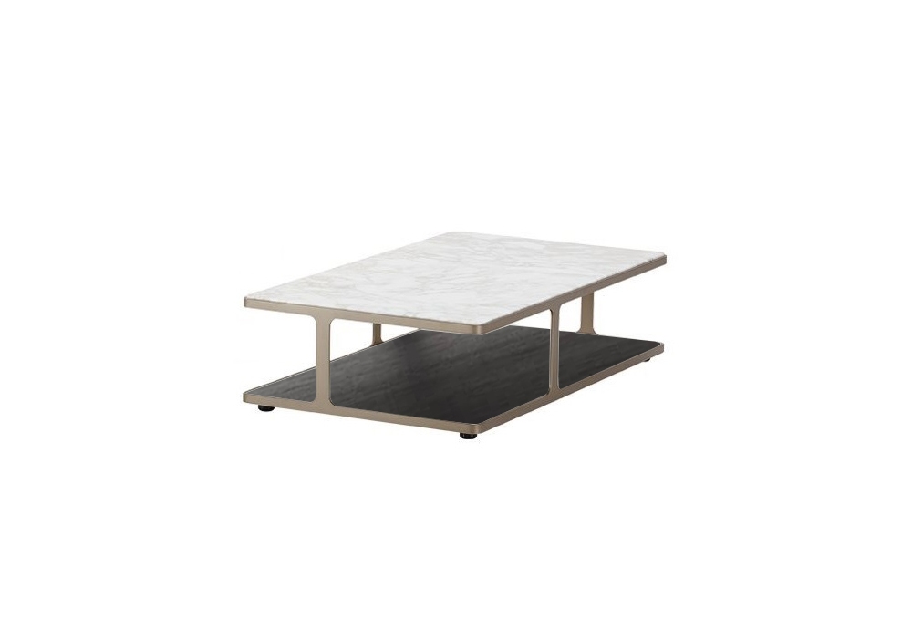 Creek von Jean-Marie Massaud für Poliform entworfen, ist ein Couchtisch mit Metallstruktur. Es hat zwei Oberteile: eine untere Holzplatte und eine obere Marmorplatte.