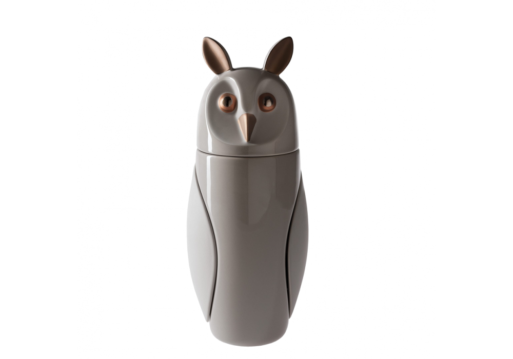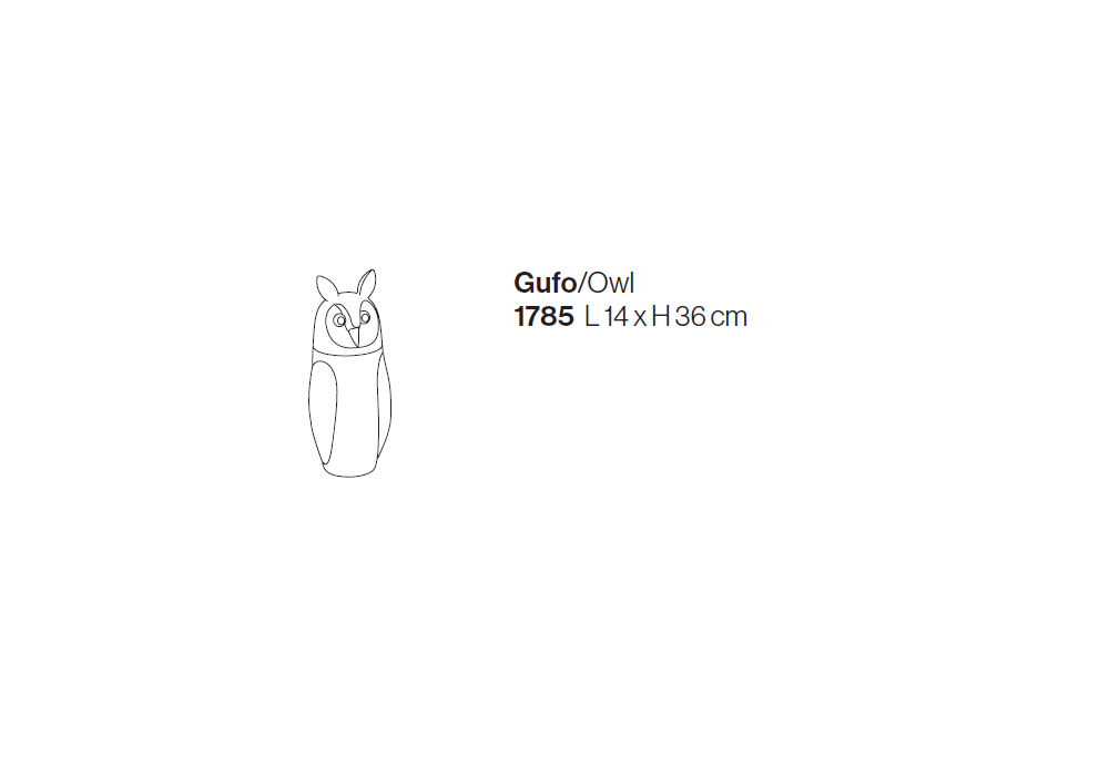 Eule Owls von Manolo Bossi für Bosa entworfen, ist eine Skulptur in Glasierte keramik mit Edelmetallen, dass darstellt eine Kreatur mit großen frontalen Augen wie Menschen. Es ist Teil der The Owls Kollektion, die auch andere 2 magische und angestammte Kreaturen, Symbole der Weisheit, Intelligenz und Schönheit umfasst.