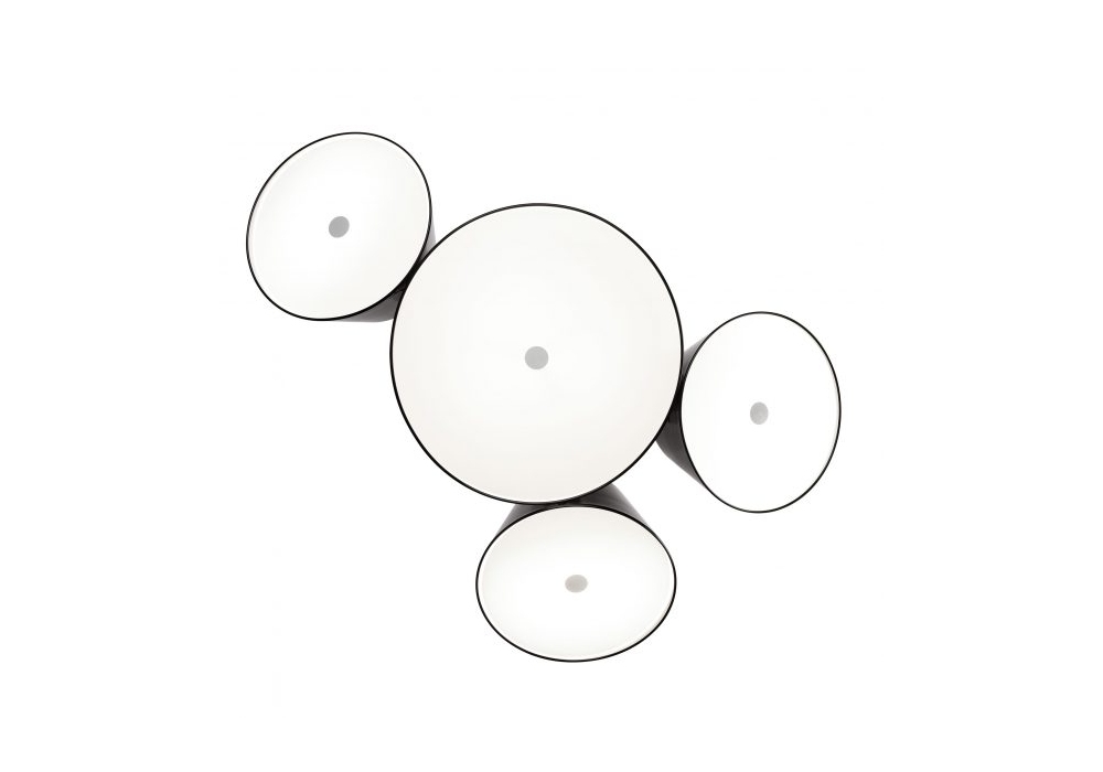 Tam Tam von Fabien Dumas für Marset entworfen, ist eine Hängelampe, die aus einem großen zentralen Aluminiumlampenschirm und drei ausrichtbaren Aluminium-Satellitenlampenschirmen besteht. Diffusoren aus Opalinmethacrylat.