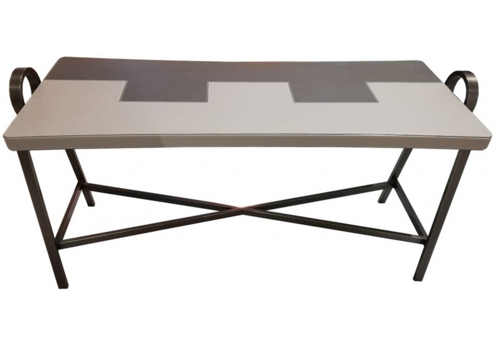 Atlantique von Olivier Gagnère für Promemoria entworfen, ist eine Konsole mit Bronzestruktur und einer zweifarbigen Glattlederoberseite: Grigio Fumo und Tortora. Die Nähte sind sichtbar.