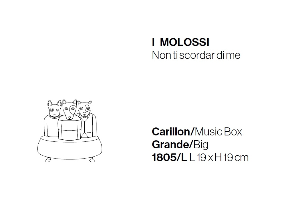 I Molossi von Elena Salmistraro für Bosa entworfen, ist eine Spieldose in Keramik, in der die traditionellen Pferde durch Mastiffs ersetzt wurden: Der beste Freund des Mannes wird so zum symbolischen Wächter, der uns durch das Leben begleitet, und zusammen mit der Musik, die uns zurückführt rechtzeitig.