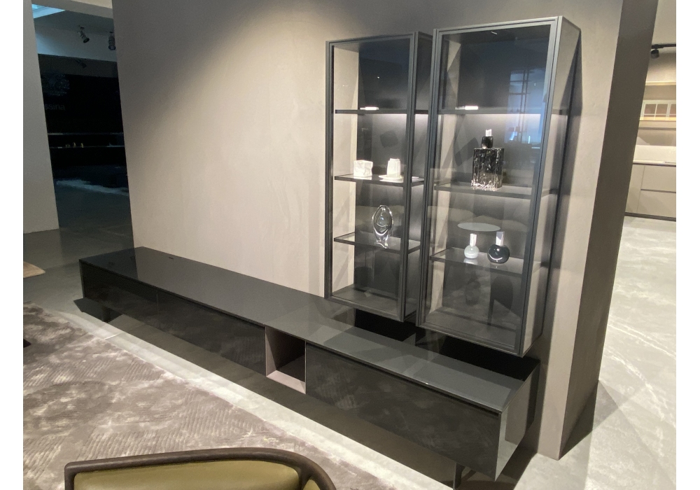 Pass-Word Evolution, von Dante Bonuccelli für Molteni&C entworfen, ist ein Wohnsystem mit einer Metallbasis in Zinnoptik, einer Struktur aus Zedern- und Frontholz, Schubladen und Klapptüren in glänzender Zinnoptik. Die vertikalen Hängevitrinen sind mit Flügeltüren aus transparentem Glas und mit 3000 ° K LEDs ausgestatteten Regalen ausgestattet.