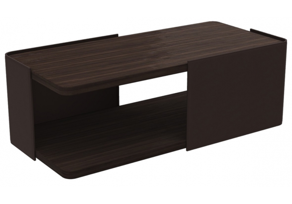 Hubert von Vincent Van Duysen für Molteni&C entworfen, ist ein rechteckiger Couchtisch mit Unter- und Oberplatte aus Eukalyptusholz. Eckstützelemente aus regeneriertem Leder in dunkelbrauner Farbe.