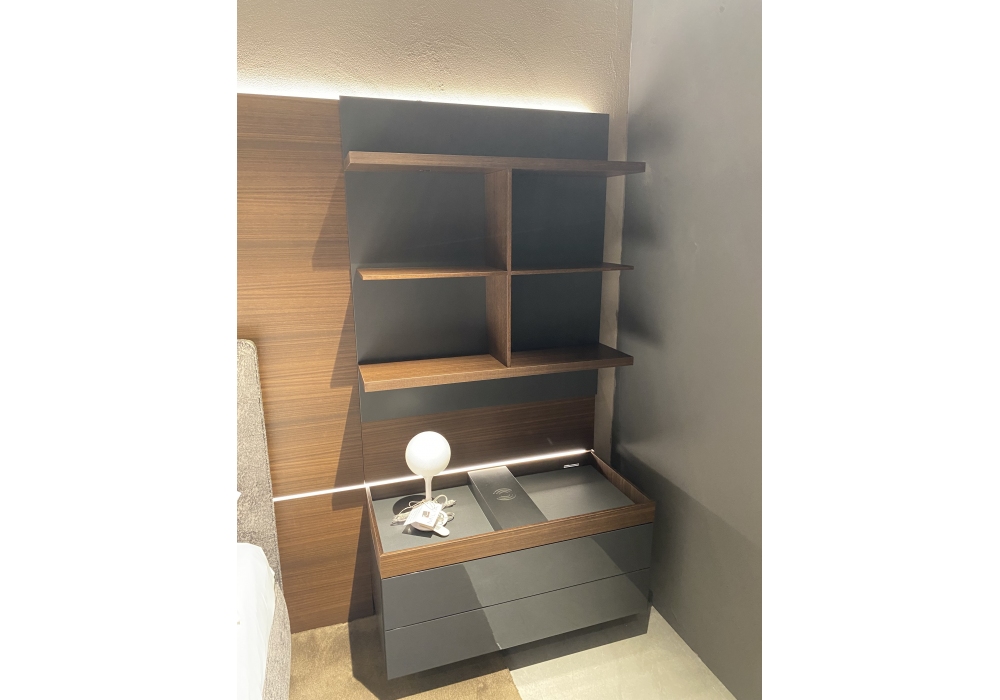 Grid, entworfen von Vincent Van Duysen für Molteni&C, ist ein modulares System für den Schlafbereich, das mit Eukalyptusholzverkleidungen ausgestattet ist, die an der Wand mit LED-Hintergrundbeleuchtung befestigt sind. Hängeschränke mit Schubladen aus grauem Ecoskin-Interieur und glänzender anthrazitfarbener Struktur. Wohnwand mit Regalen in Eukalyptus-Essenz.