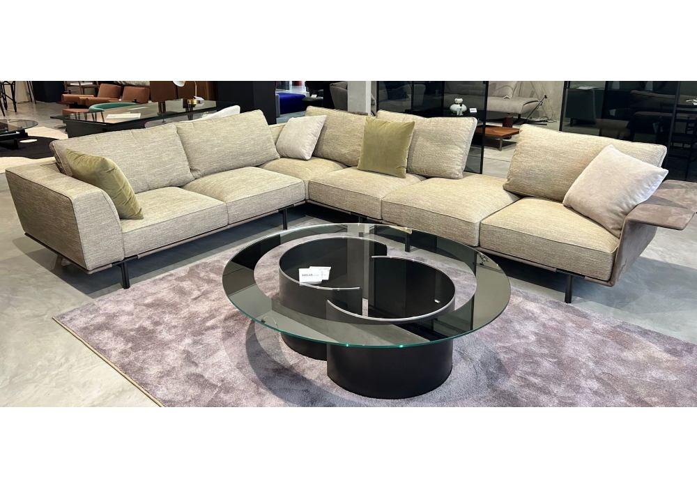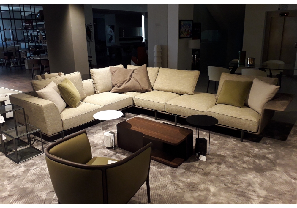 Gregor von Vincent Van Duysen für Molteni&C entworfen, ist ein modulares Sofa mit Stoffbezug. Sockel und Füße zinnfarben lackiert. Dekokissen inklusive!