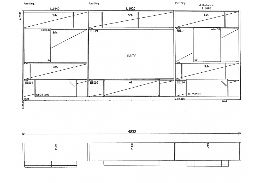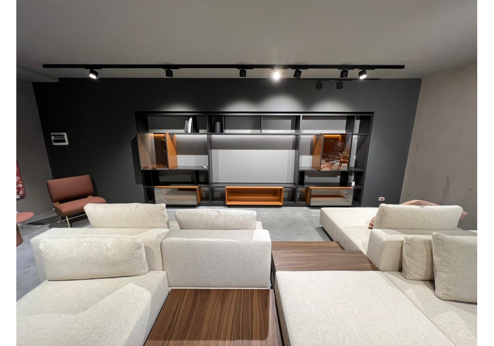505 UP entworfen von Nicola Gallizia für Molteni&C, ist ein flexibles modulares System mit den Eigenschaften eines fertigen Möbelstücks mit einer lackierten Rückseite in mattem London Sky-Finish. Regale, Seiten und Sockel in matt lackiertem Mokka-Finish und vorstehende Elemente in Spice-Finish mit transparenten Glastüren. Komplett mit Beleuchtungsleisten für 3000 ° K Innenfächer.