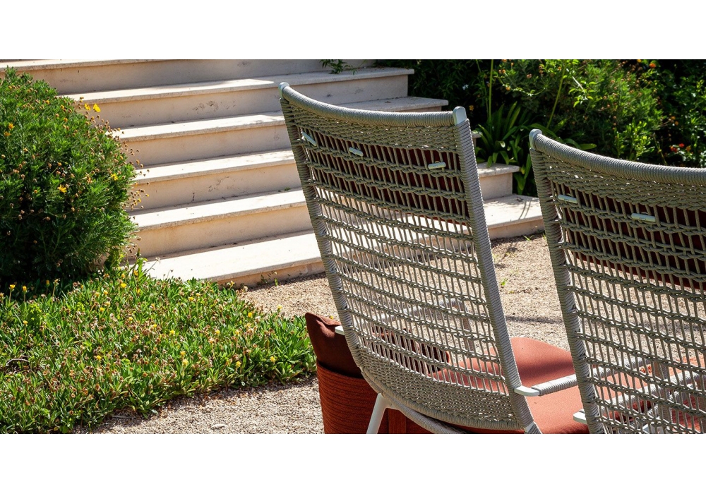 Solaria von Ludovica und Roberto Palombo für Poltrona Frau entworfen, ist ein Outdoor-Sessel bestehend aus einer Edelstahlstruktur mit Epoxidpulverlackierung in Kreidefarbe (RAL 9002). Rückenlehne und Sitzfläche zeichnen sich durch ein besonderes Gewebe mit Ecru-Polypropylenseil aus und Kopfstütze und Sitzkissen aus Polyesterfaser mit wasserabweisendem Polyesterbezug.