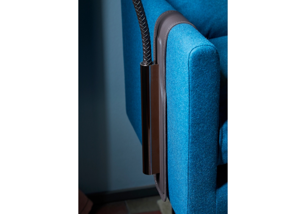 G+T Battery von Jan Van Lierde für Contardi entworfen, ist eine Leseleuchte aus glänzendem Kupferbronze-PVD und einer Struktur aus dunkelbraunem geflochtenem Leder. Befestigung für Sitze und Polster in dunkelbraunem Leder.