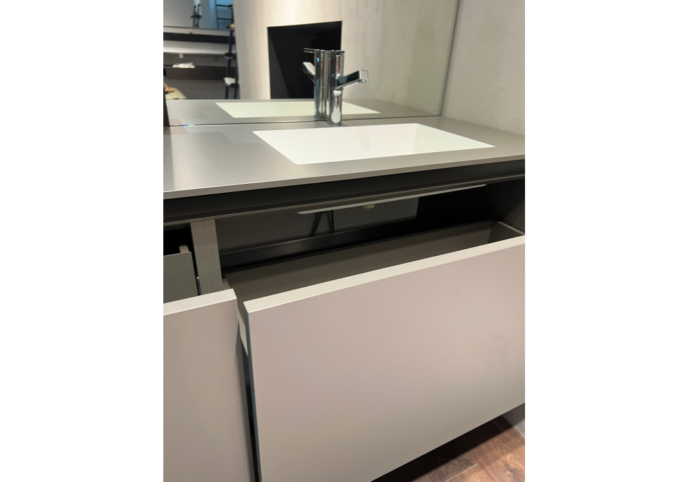 Modulnova Badezimmersystem bestehend aus zwei freistehenden Schubladen, Platte mit eingebautem Waschbecken und Regal mit Metallstruktur, Holzregalen und zwei Schubladen mit Klappöffnung.