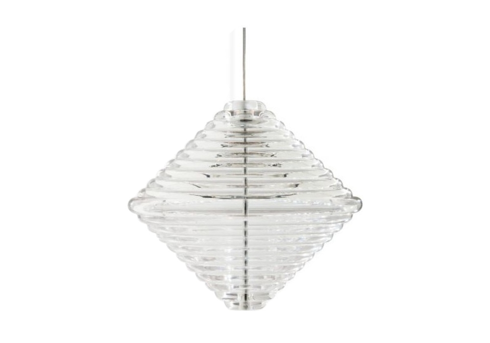 Press Cone von Tom Dixon entworfen, ist eine Hängeleuchte aus dickem und transparentem Glas mit abgerundeten linearen Oberflächendetails.