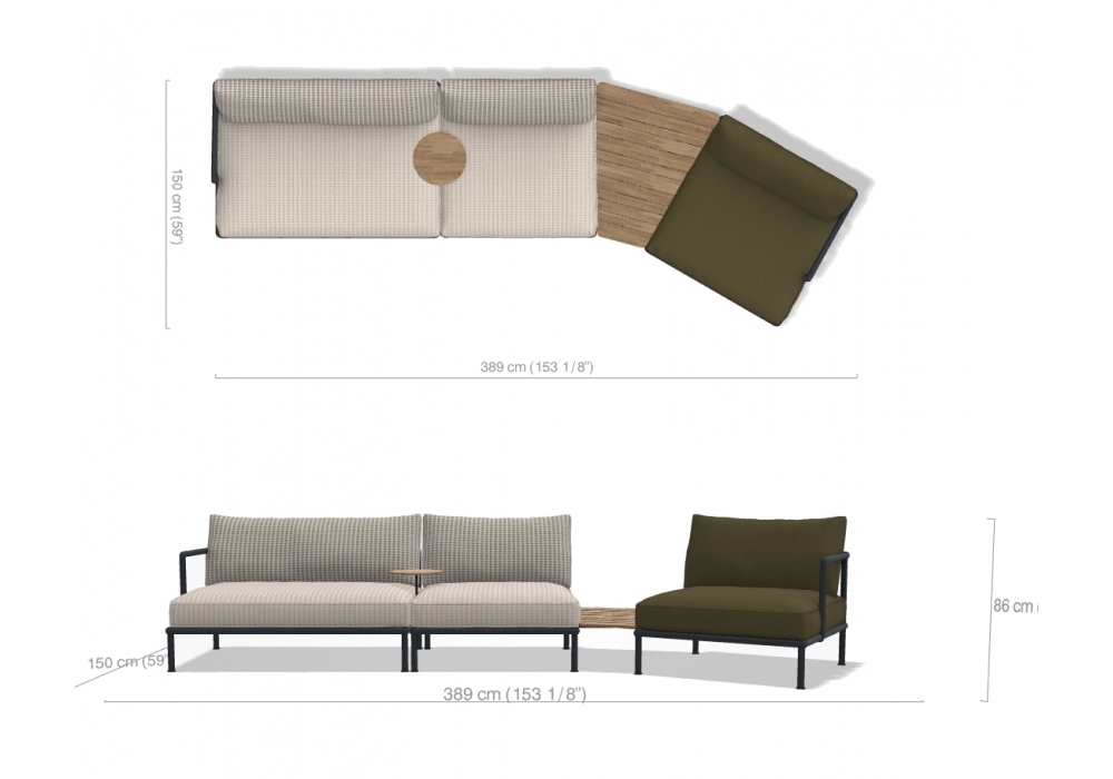 Nooch von Piero Lissoni für B&B Italia Outdoor entworfen, ist ein modulares Sofa, das aus einer recycelten Aluminiumstruktur, einer Polsterung aus biologisch abbaubarer Polyesterfaser aus PET, einem flachen Einsatz und einem Serviceelement aus Massivholz und einer Bezug aus Outdoor-Stoff besteht.
