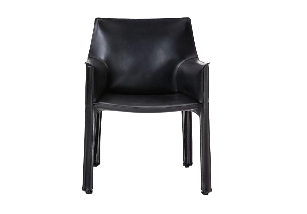 413 Cab Pro von Mario Bellini für Cassina entworfen, ist ein Armstuhl mit Stahlstruktur und schwarzem Kernlederbezug.