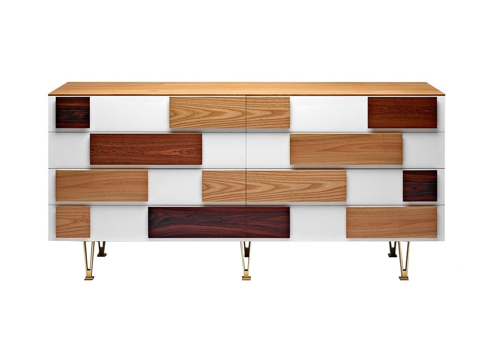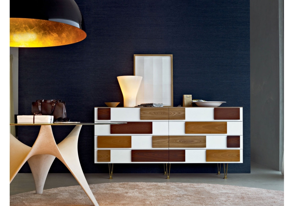 D.655.1 von Gio Ponti für Molteni&C entworfen, ist eine Kommode, die sich durch handbemalte weiße Schubladenfronten mit aufgesetzten Griffen aus verschiedenen Essenzen (Ulme, Nationalnuss, Mahagoni und Rosenholz) auszeichnet. Die Ulmenholzstruktur wird von satinierten Messingfüßen getragen.