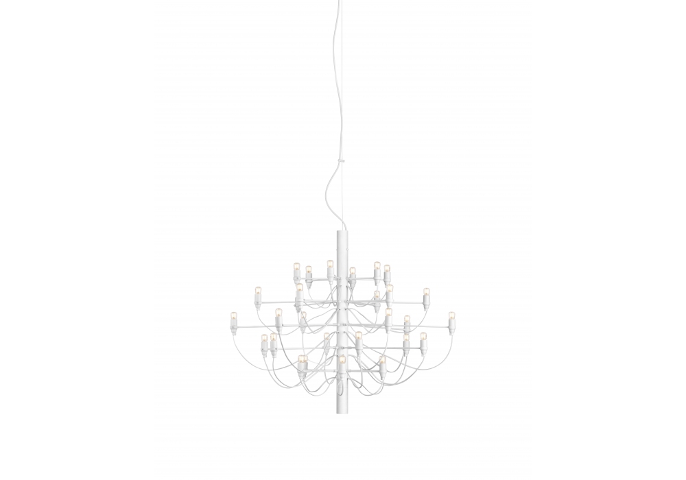 2097/30 von Gino Sarfatti für Flos entworfen, ist ein runder Leuchter mit Struktur aus weiß lackiertem Stahl. Die Diffusoren bestehen aus Glas und verwenden LED-Lampen mit einer transparenten Glühbirne.
