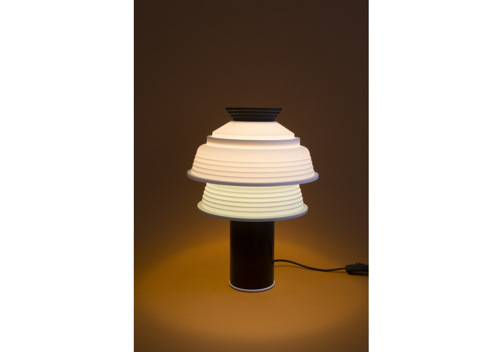 TL4 von Sowden ist eine LED-Tischleuchte mit Silikon-Lampenschirm in Schwarz-Weiß-Grün-Finish und schwarzem Aluminium-Lampenkörper.