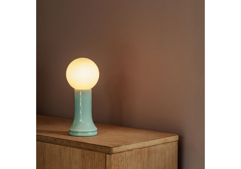 Shore von Tala entworfen, ist eine Tischleuchte aus mundgeblasenem Recyclingglas mit sea green Oberfläche und mattweißem Diffusor. Komplett mit Dimmer am Kabel und ausgestattet mit Dim to Warm-Technologie.