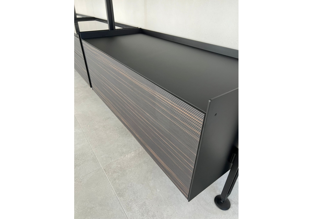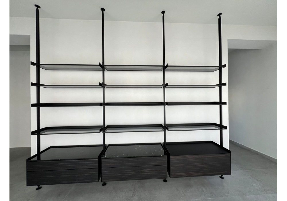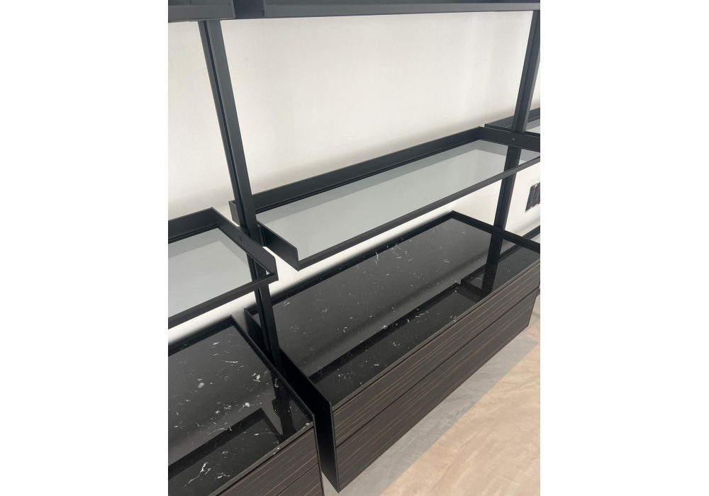 Zenit von Giuseppe Bavuso für Rimadesio entworfen, ist ein Wand-Bücherregal mit einer schwarzen Struktur, Behältern mit Schubladen Tinto Ebano Taiga, einer Platte aus glänzend schwarzem Marquiña-Marmor und vier Tischsets aus Kunstleder, 159 Etna-Finish.