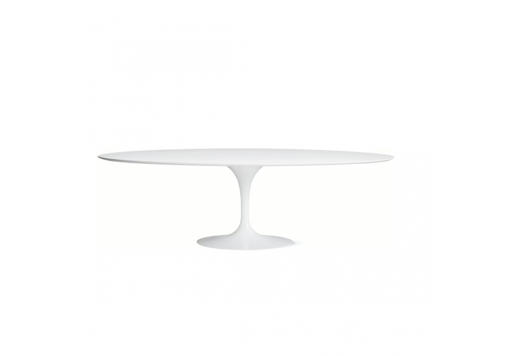 Saarinen von Eero Saarinen für Knoll entworfen, ist ein Tisch mit einer weißen Laminatplatte und einem behandelten Aluminiumgestell mit einer weißen Rilsan-Schutzbeschichtung.