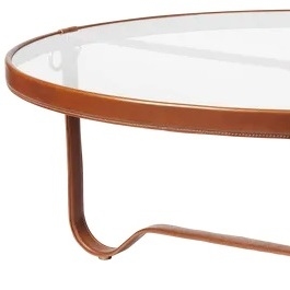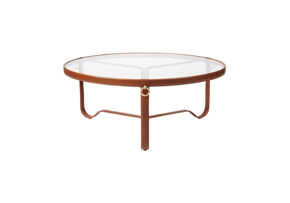 Adnet von Jacques Adnet für Gubi entworfen, ist ein runder Couchtisch bestehend aus einer lederbezogenen Struktur und einer Glasplatte.