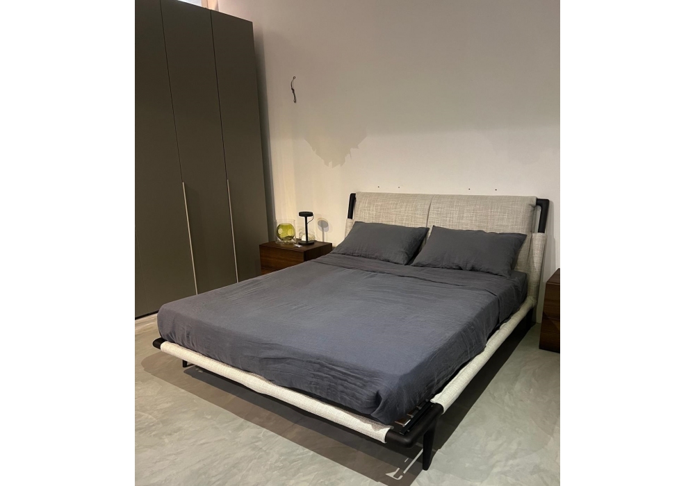 Gaudí von Matteo Nunziati für Flou entworfen, ist ein Bett mit einer Metall- und Massivholzstruktur, Cafés und einer Stoffpolsterplatte. Komplett mit Matratze 170 x 200, weißem Polsterbezug, zwei Kissen und zwei Zierkissen mit Adam Laguna-Stoffbezug.
