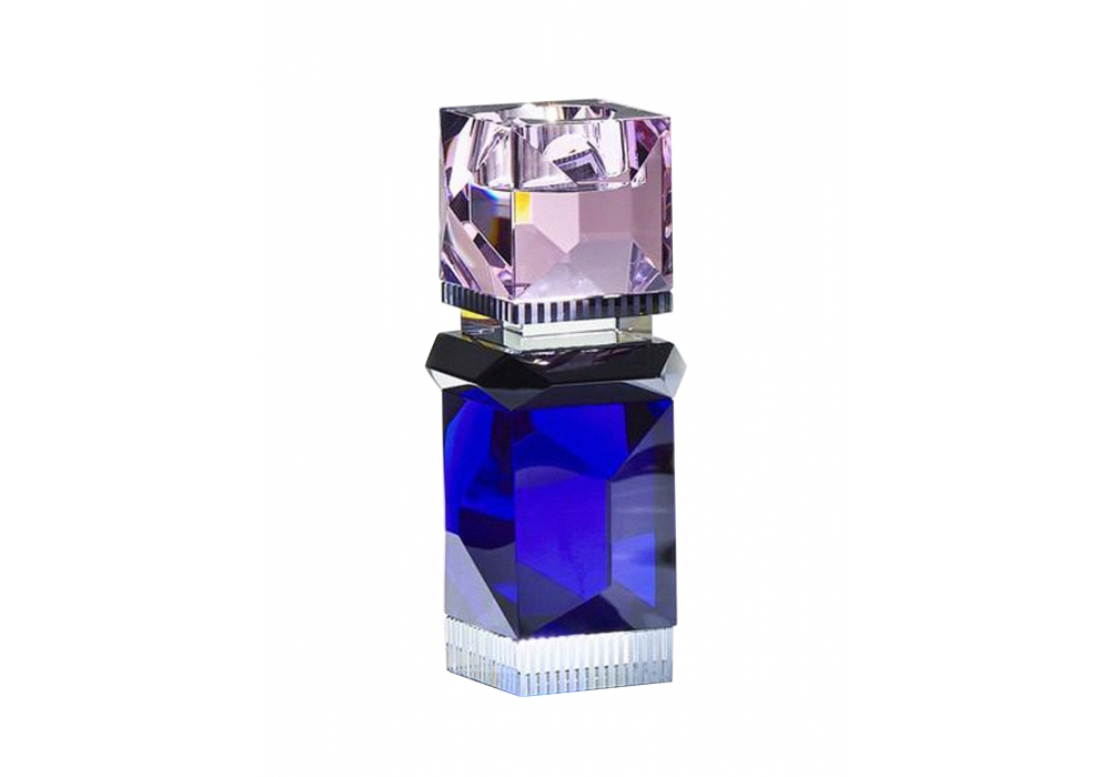 Miami hergestellt und entworfen von Reflections Copenhagen, ist ein Kerzenhalter aus geschnitztem und handbearbeitetem rechteckigem Kristall in Pink, transparentem Schwarz und Kobalt.