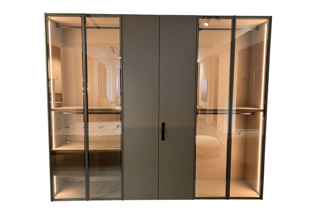 Der Kleiderschrank Milano-Plana von Pianca vereint Eleganz und Funktionalität mit einer Außenverkleidung in Materico Ecru, Innenausstattung und Einlegeböden in Materico Bon Ton. Ausgestattet mit Mangan-Accessoires, Palladio-Rahmen und Türen aus reflektierendem Bronzeglas ist er mit LED-Beleuchtung ausgestattet. Die Griffe C25 Cuoio Moro runden das Design ab. Ein zusätzlicher Einlegeboden ohne Beleuchtung sorgt für mehr Funktionalität.