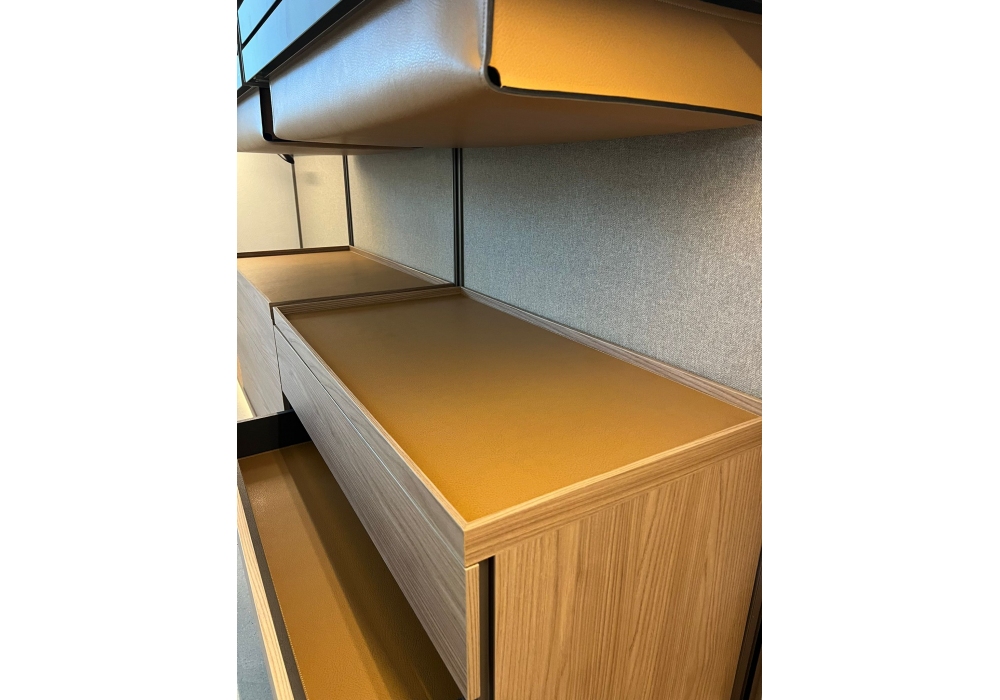 Dress Bold von Giuseppe Bavuso für Rimadesio entworfen, ist ein begehbarer Kleiderschrank mit schlichtem und raffiniertem Design. Die Struktur aus Ecolorsystem® Bronzo harmoniert mit dem Stoffpaneel aus Dolomiti. Die Elemente aus Ulmenholz, vom Sockel über das Regal bis zur Kommode, verleihen dem Schrank einen natürlichen und eleganten Touch, während der Bezug aus Miele-Kunstleder Komfort und Raffinesse verleiht.