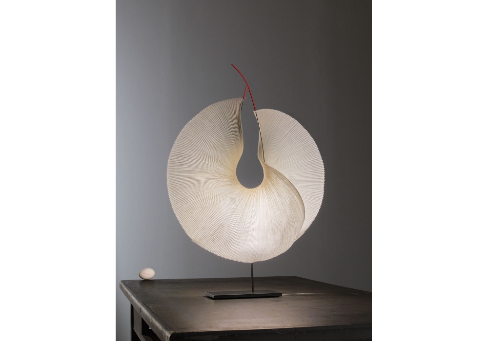 Yoruba Rose von Ingo Maurer ist eine Tischlampe mit eingebauten LEDs und Dimmschalter. Es besteht aus einem Metallsockel und einem Lampenschirm aus japanischem Papier, der kreisförmig auf leichten Metalldrähten gespannt ist.