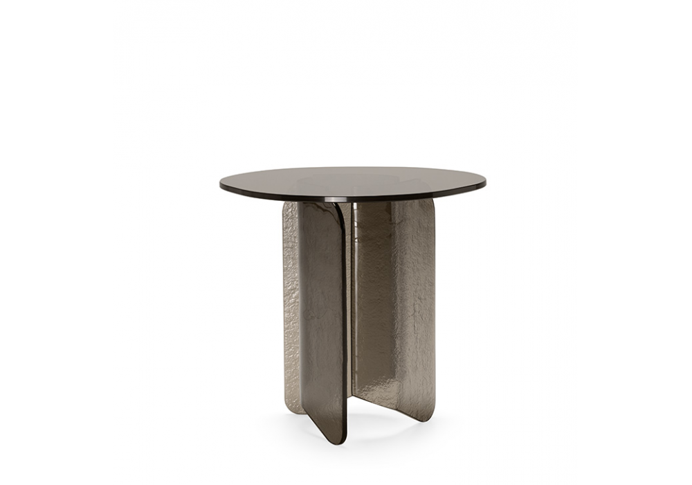 Fleur von Christophe Delcourt für Molteni&C entworfen, ist ein Beistelltisch mit runder Platte aus bronzierter Glasplatte, die auf drei konzentrisch angeordneten, geschwungenen Beinen ruht, die an Blütenblätter erinnern.