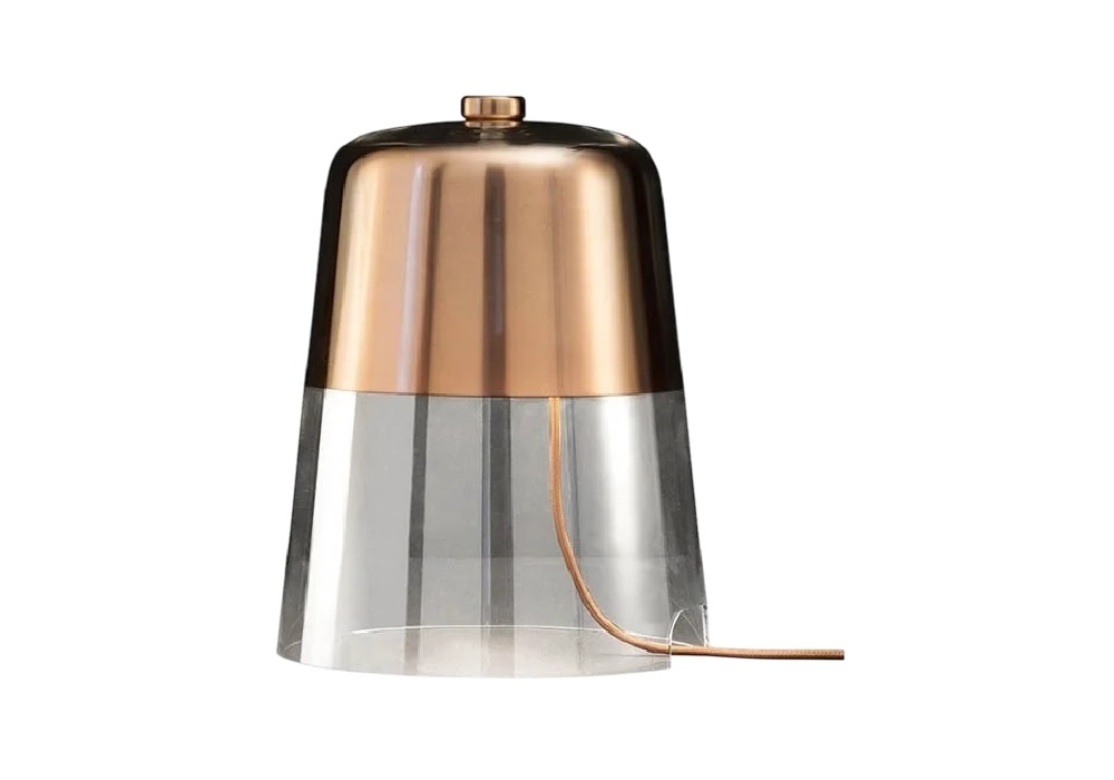 Semplice 226 von Sam Hecht für Oluce entworfen, ist eine Tischlampe mit einer einzelnen transparenten Glocke aus mundgeblasenem Glas und einem Drehdimmer an der Oberseite. Die Innenoberfläche ist in satiniertem Kupfer gehalten.