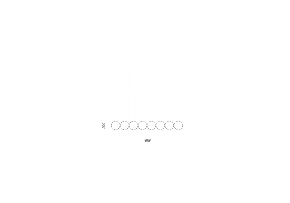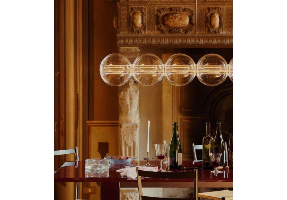 Luce Sferica von Ronan Bouroullec für Flos entworfen, ist eine Hängeleuchte mit einer Struktur aus poliertem extrudiertem Aluminium und kugelförmigen Modulen aus transparentem Borosilikatglas. Das Netzteil ist in die Rosette integriert. Über die Touch-Bedientaste an einem Ende des Produkts können drei verschiedene Modi gesteuert werden.