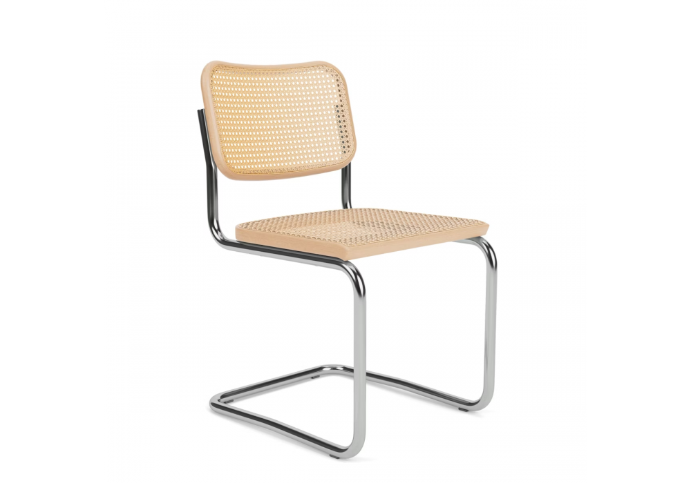 Cesca von Marcel Breuer für Knoll entworfen, ist ein Stuhl mit einem Gestell aus verchromtem Stahlrohr und einer Sitzfläche aus naturlackiertem Buchenholzgeflecht.
