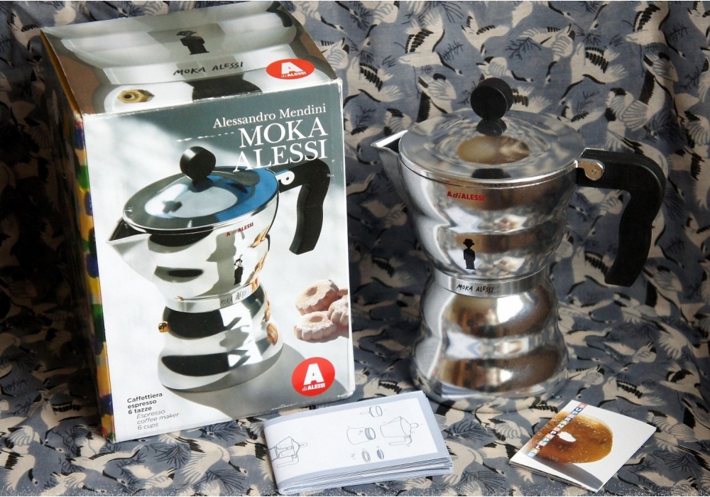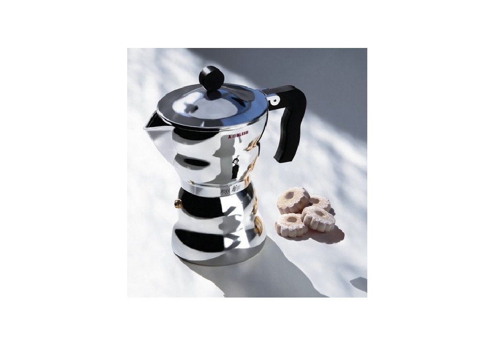 AAM33 Moka von Alessandro Mendini für Alessi entworfen, ist eine Espressomaschine aus Gußaluminium. Griff und Knopf aus thermoplastischem Harz, schwarz. Verfügbar in 1,3 oder 6 Tassen.