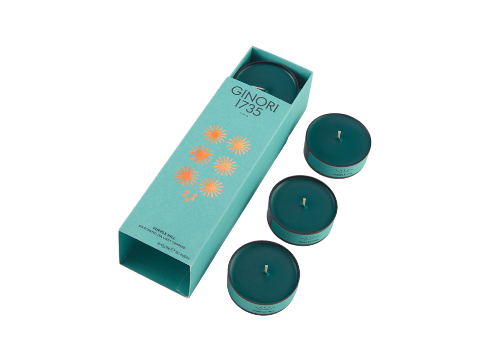 Tea Light Purple Hill Refill von Ginori 1735 ist ein Set aus sechs 40-g-Nachfüllkerzen für die Kerzenhalterstatue L'Amante.