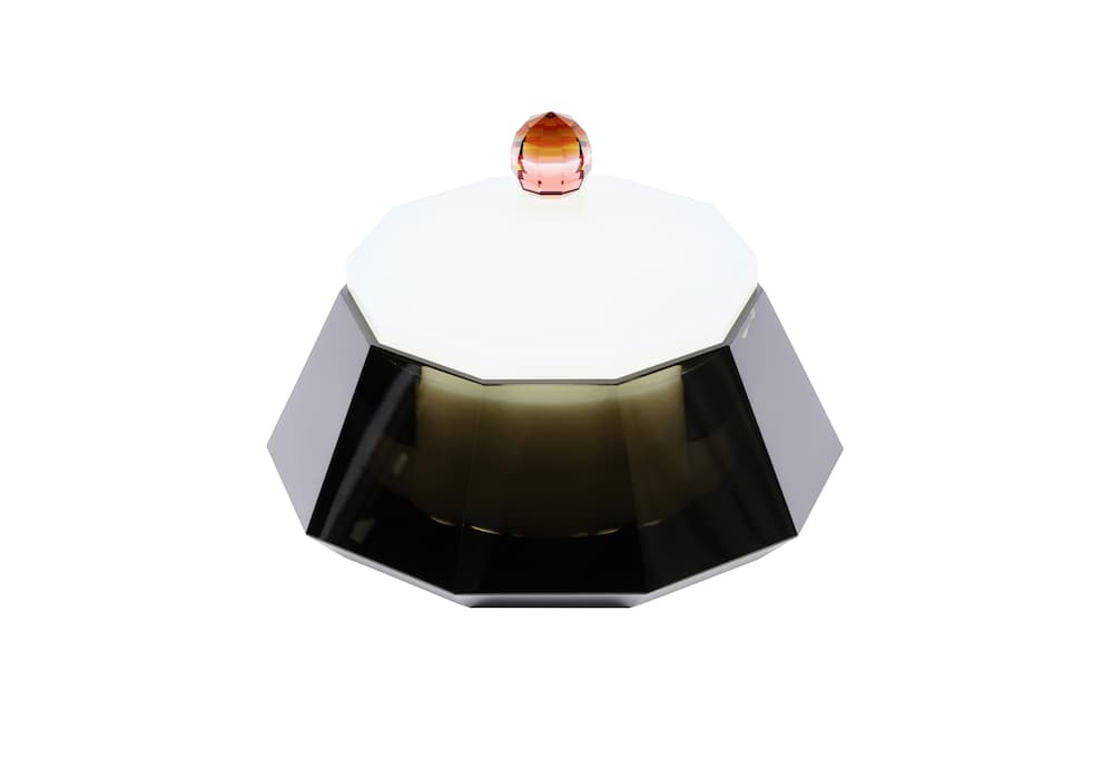 Sofie hergestellt und entworfen von Reflections Copenhagen, ist eine Duftkerze mit einer Struktur aus braunem, transparentem, rotem, transparentem, weißem und braunem Kristall.