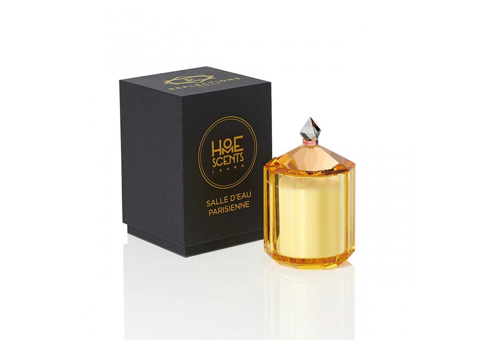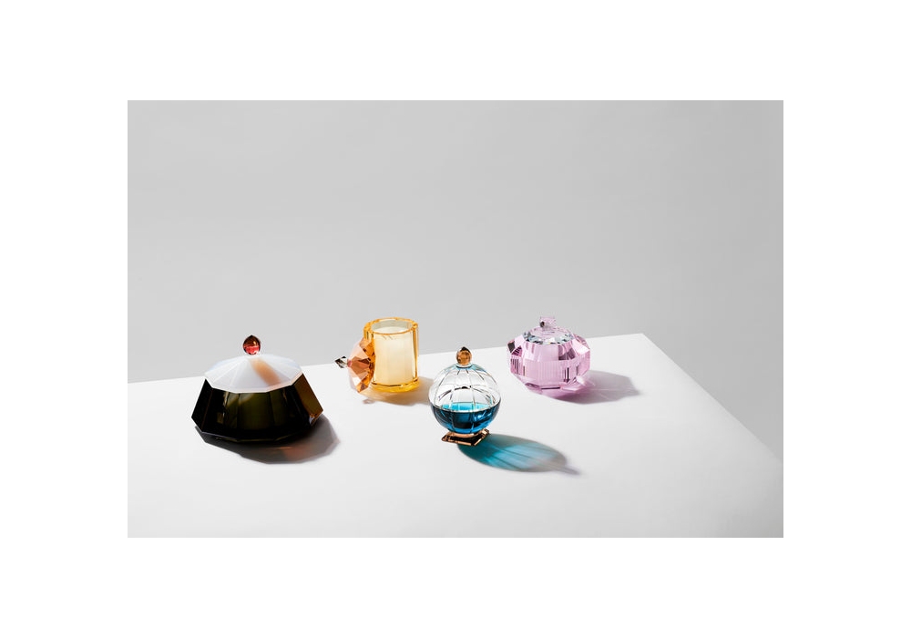 Laura hergestellt und entworfen von Reflections Copenhagen, ist eine Duftkerze mit einer Struktur aus gelbem, rotem und grauem Kristall.