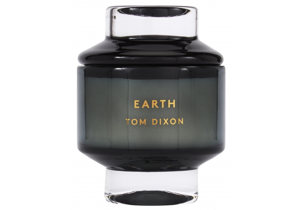 Elements Earth von Tom Dixon entworfen, ist eine Duftkerze mit einem frischen Duft, einer Mischung aus Minze, Guajakholz und Zedernholz, eingeschlossen in einer dunklen Vase aus mundgeblasenem Glas. Erhältlich in zwei Größen.