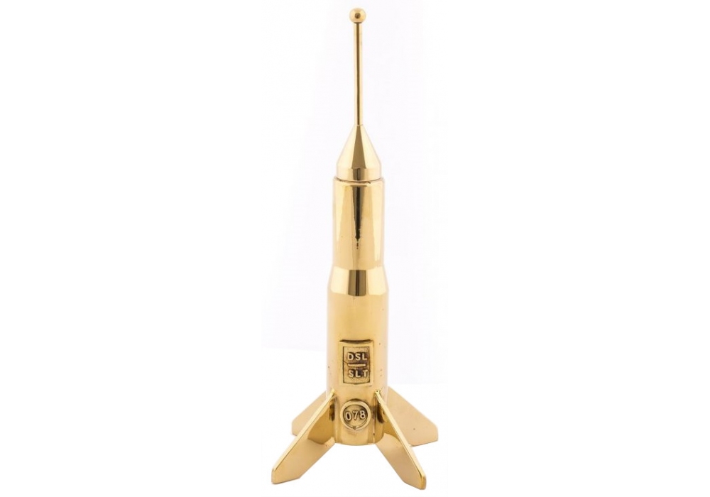 Cosmic Diner-Hard Rocket 2 entworfen und hergestellt von Seletti ist ein torpedoförmiger Messingkandelaber mit Bronzefinish.