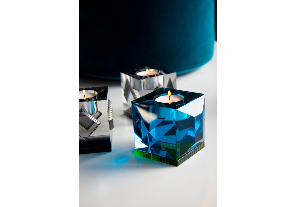 Cleveland hergestellt und entworfen von Reflections Copenhagen, ist ein Kerzenhalter aus geschnitztem und handbearbeitetem rechteckigem Kristall in transparent und schwarz.