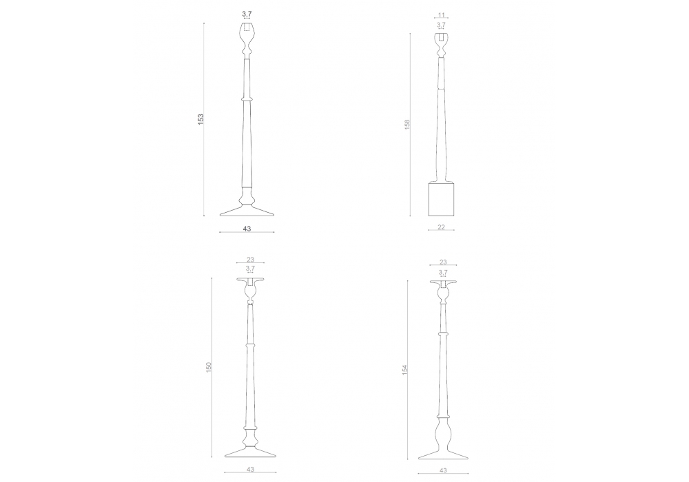 | Abmessungen | Ø 43 x H 153 cm; Ø 22 x H 158 cm; Ø 43 x H 150 cm; Ø 43 x H 154 cm. |