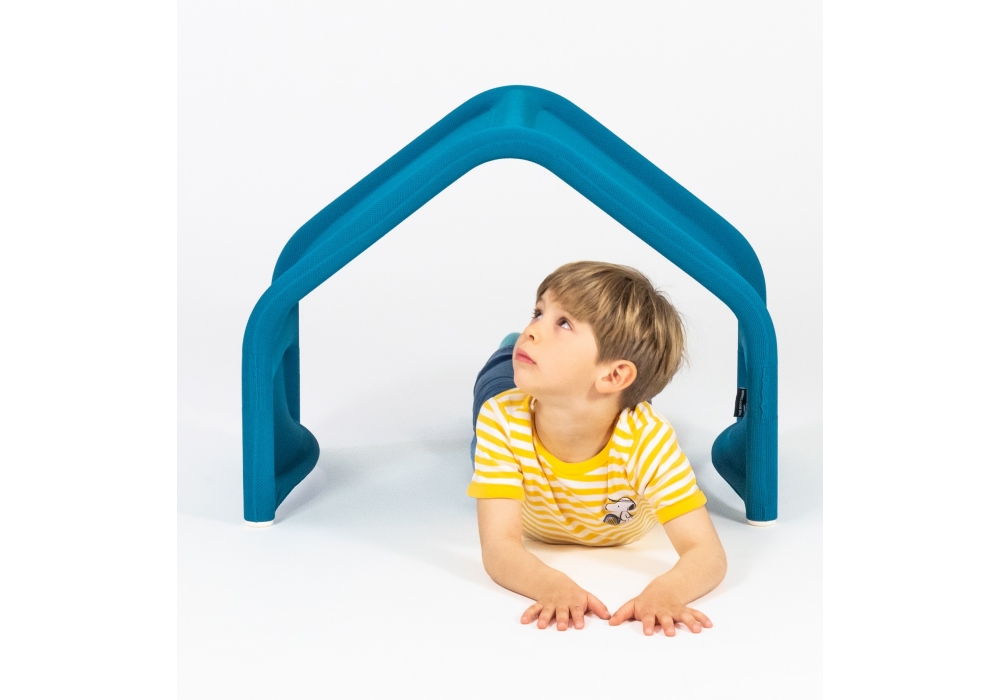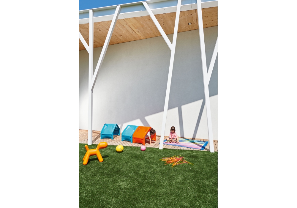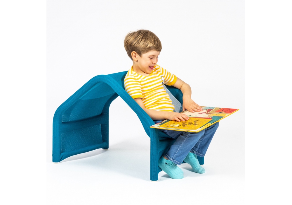 The Roof Chair von Spalvieri & Del Ciotto für Magis Me Too entworfen, ist ein Kindersessel mit einer Struktur aus Aluminiumrohren. Zentrales Querstück mit flexiblem Polyurethanschaum und Polyesterpolsterung in zwei Ausführungen überzogen.