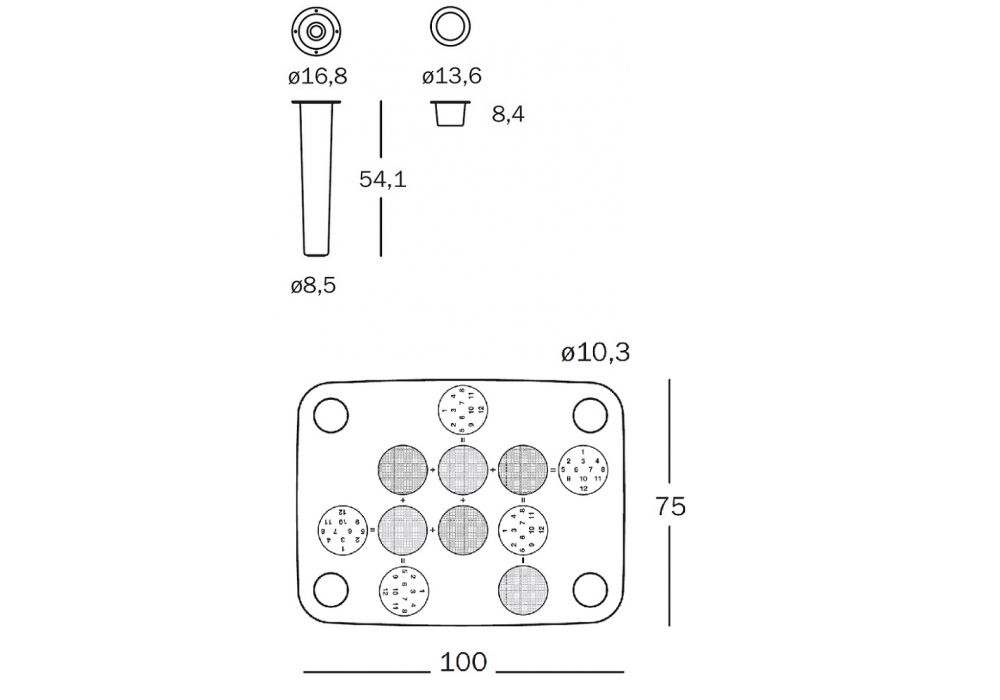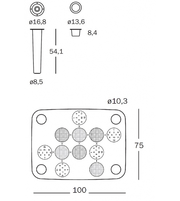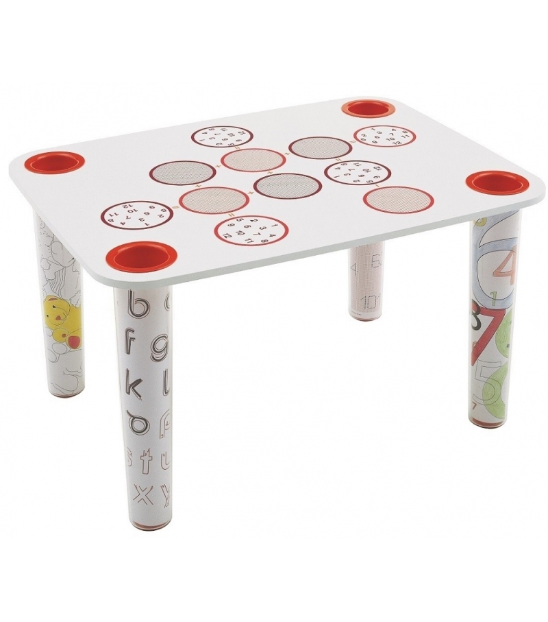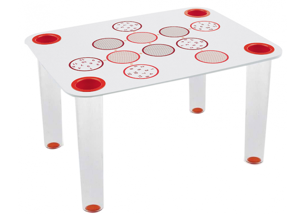 Little Flare Circle von Marcel Wanders für Magis Me Too entworfen, ist ein Tisch mit MDF-Platte, die mit Polymerblatt bedeckt und perforiert ist, um die Stiftablagen aufzunehmen. Beine aus neutralem transparentem Polycarbonat. Erhältlich mit oder ohne ABS-Stiftablage.