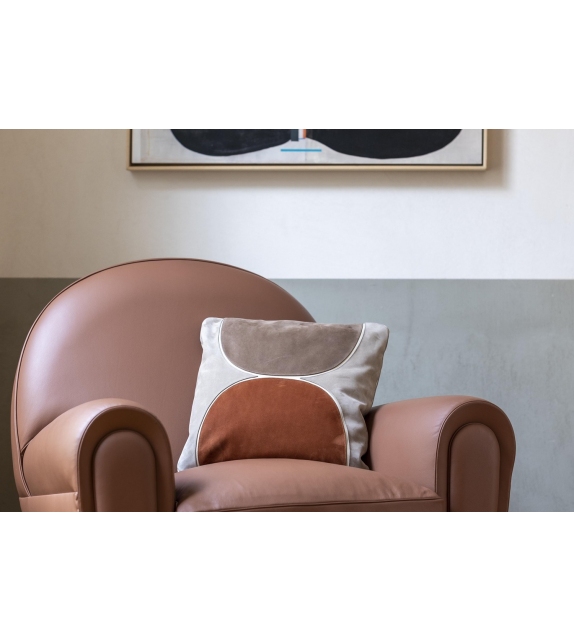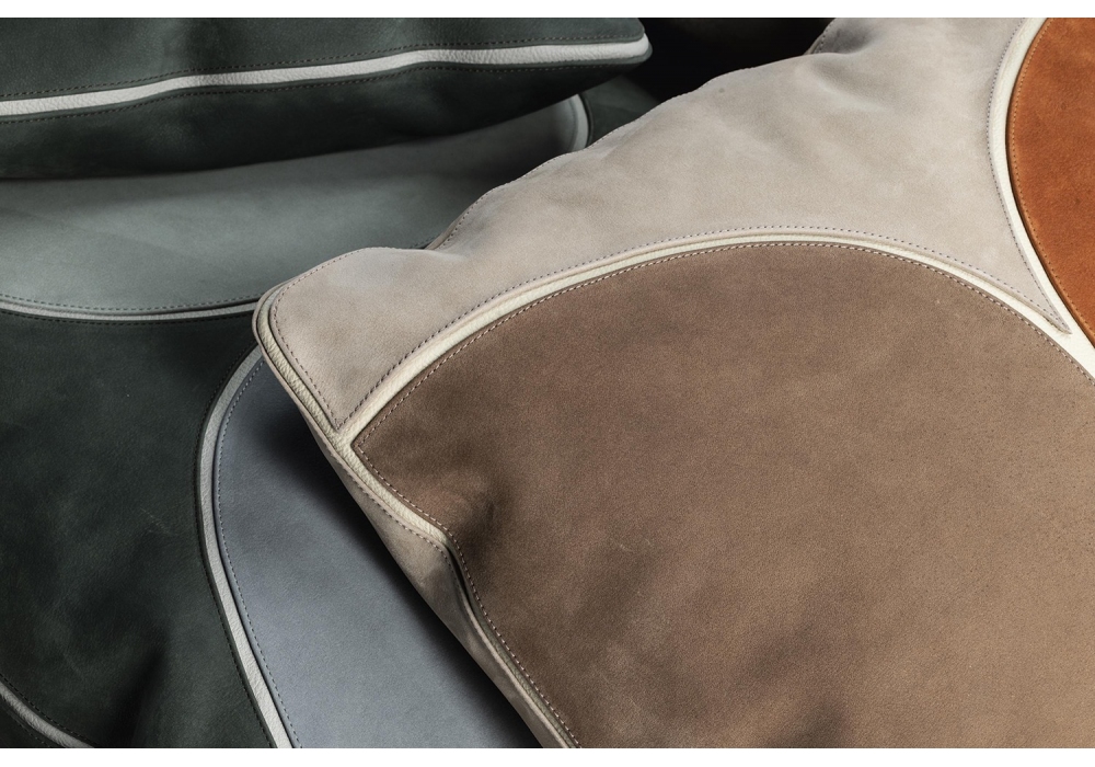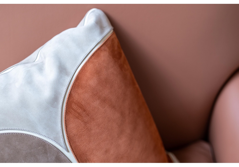 Ikiperu, entworfen von Kristine Five Melvær für Poltrona Frau, ist ein Kissen, das mit einer Kombination verschiedener Leder gepolstert ist. Das Design mit Relieffiguren besteht aus Pelle Frau® Velvety-Leder auf einem Pelle Frau® ColorSphere®-Lederhintergrund.
