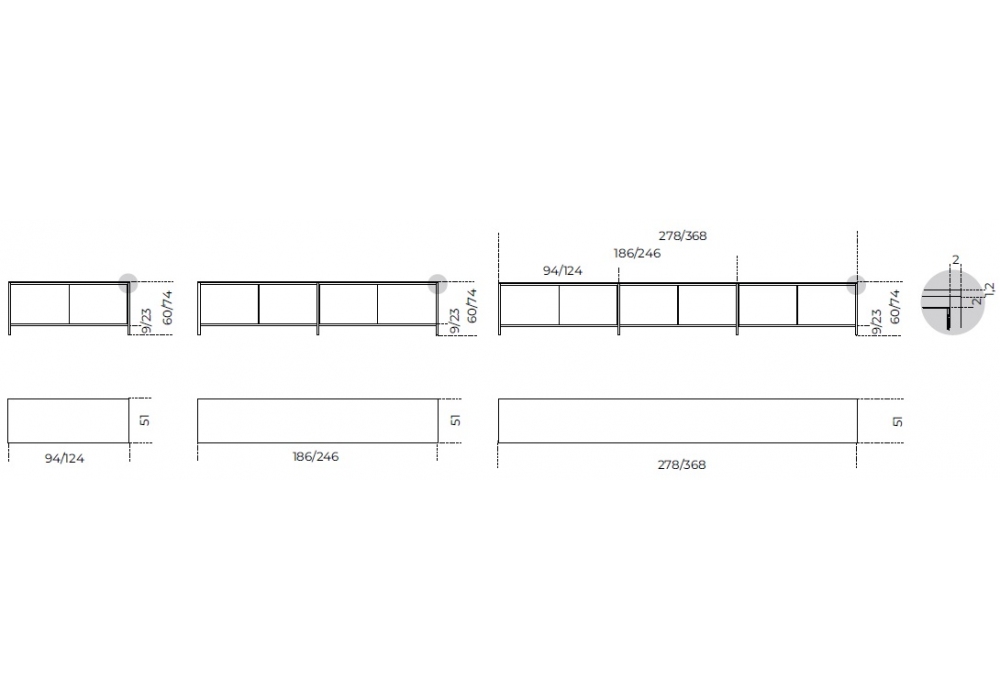 | Länge | 94 / 124 / 186 / 246 / 278 / 368 cm |