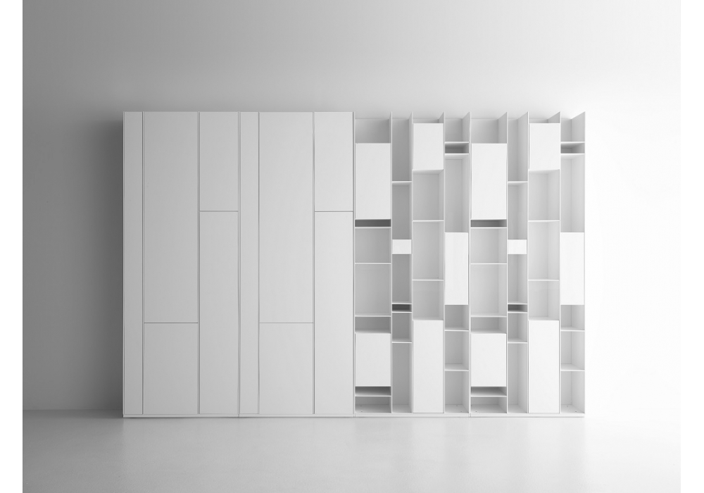 Random Cabinet von Neuland Industriedesign für MDF Italia entworfen, ist eine Aufbewahrungseinheit mit Fächern mit vordefinierten Abmessungen, die durch Türen geschlossen werden. Hergestellt aus mikrogeprägten weiß lackierten Holzfaserplatten mittlerer Dichte. Interne verstellbare Regale. Rückseite aus weißem Melamin.