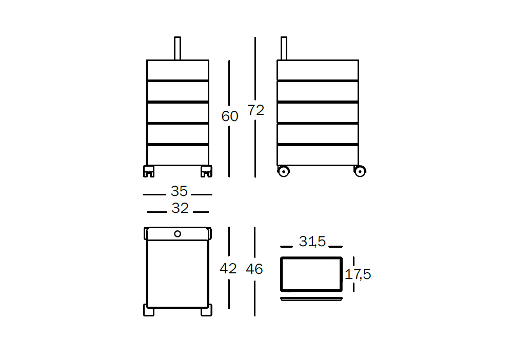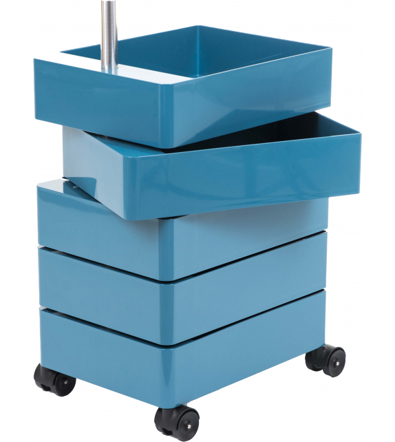 360° Container von Konstantin Grcic für Magis entworfen, ist eine niedrige Kommode aus glänzendem ABS, komplett mit Tablett und der Möglichkeit, ein zusätzliches Tablett hinzuzufügen. Verbindungsrohr aus poliertem Aluminium. Erhältlich in verschiedenen Ausführungen.