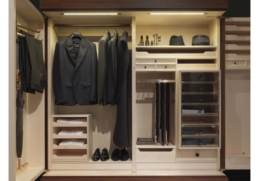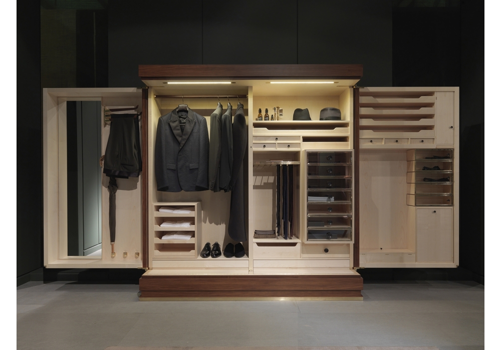 Gentleman designed by Guglielmo Ulrich for Ceccotti Collezioni is a wardrobe made in rosewood, internal in maple wood, handles in ebony and rosewood, internal drawer unit, metal parts in polished brass. Doors in parchment.