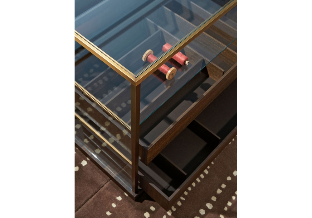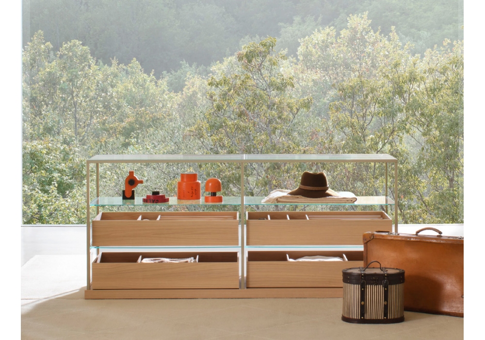 Ideal both for the home as well as for the most elegant shops, Acquario designed by Piero Lissoni for Porro is the new central drawer unit, perfect in the middle of a room, made in transparent glass with metal profiles; it’s divided in 3 shelves and customizable with wooden trays, in order to leave the contents visible, store them in perfect order and then extract them with ease.